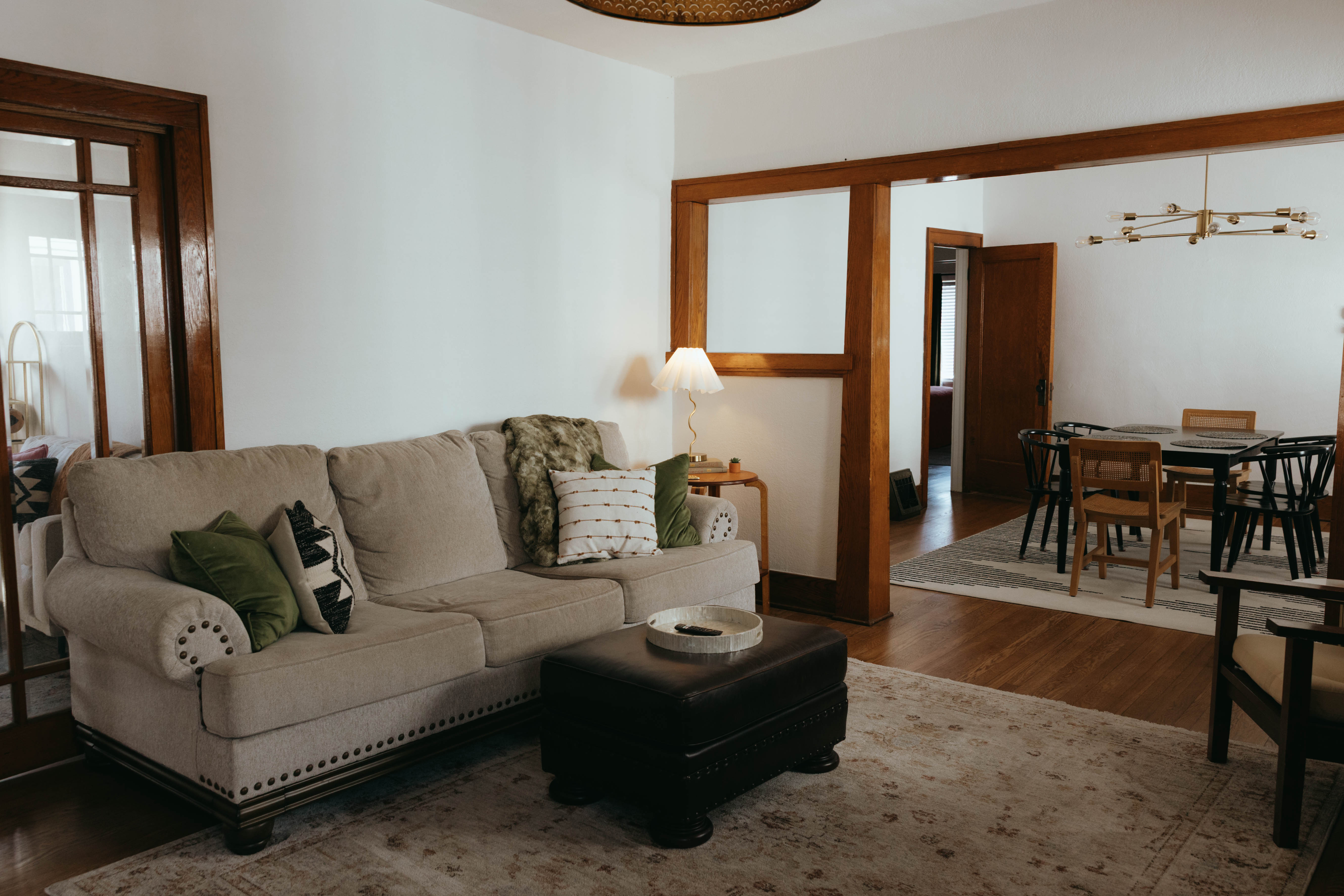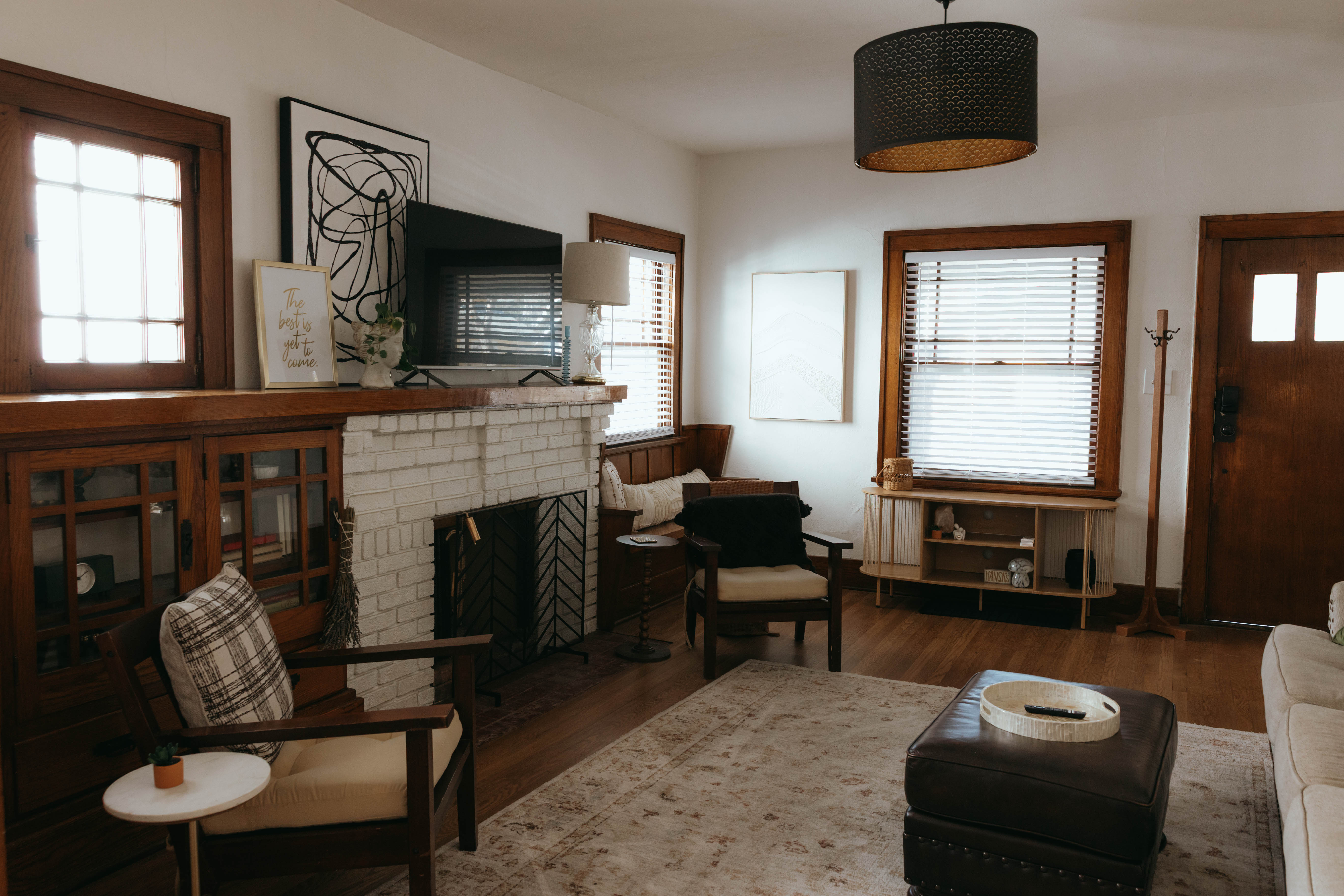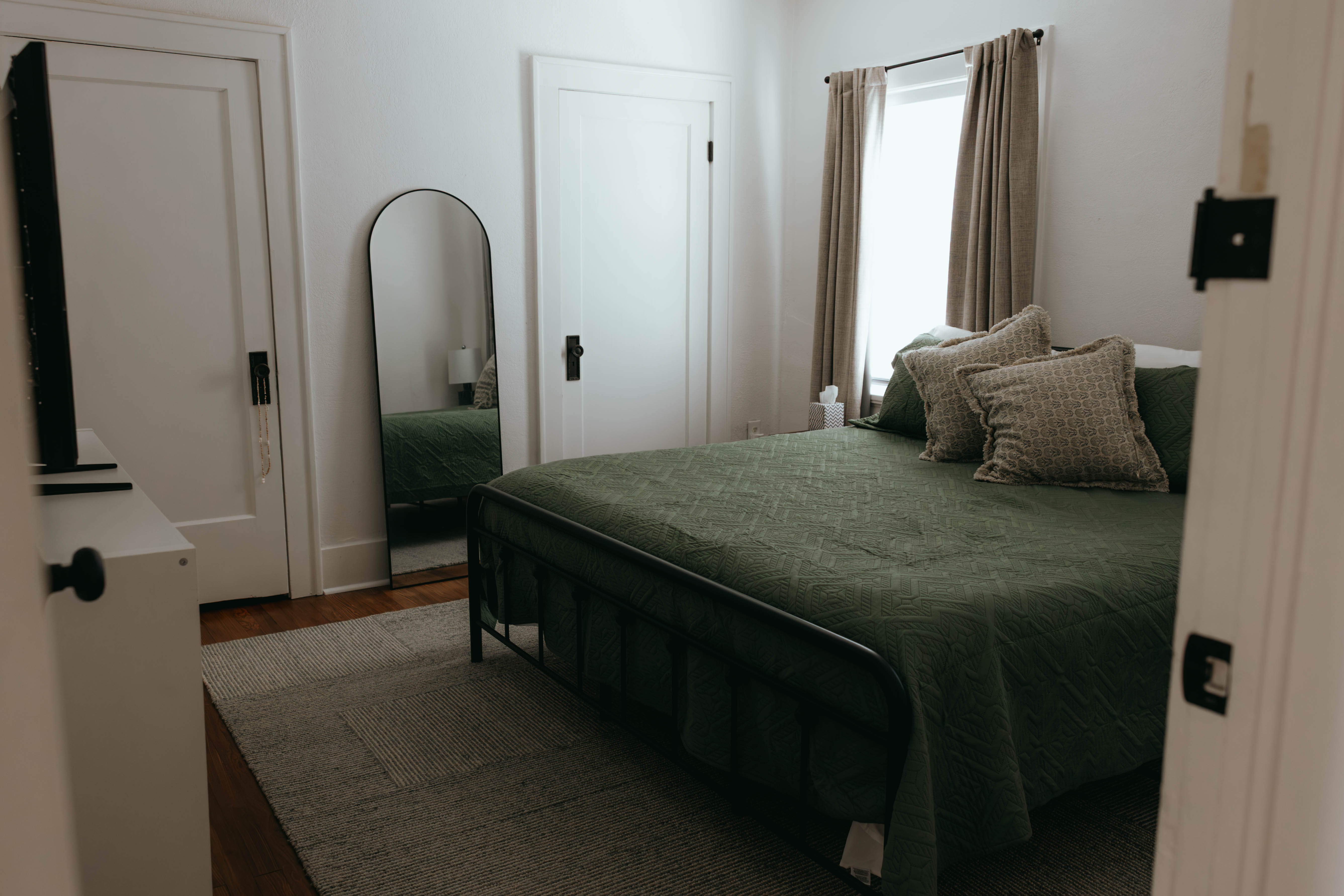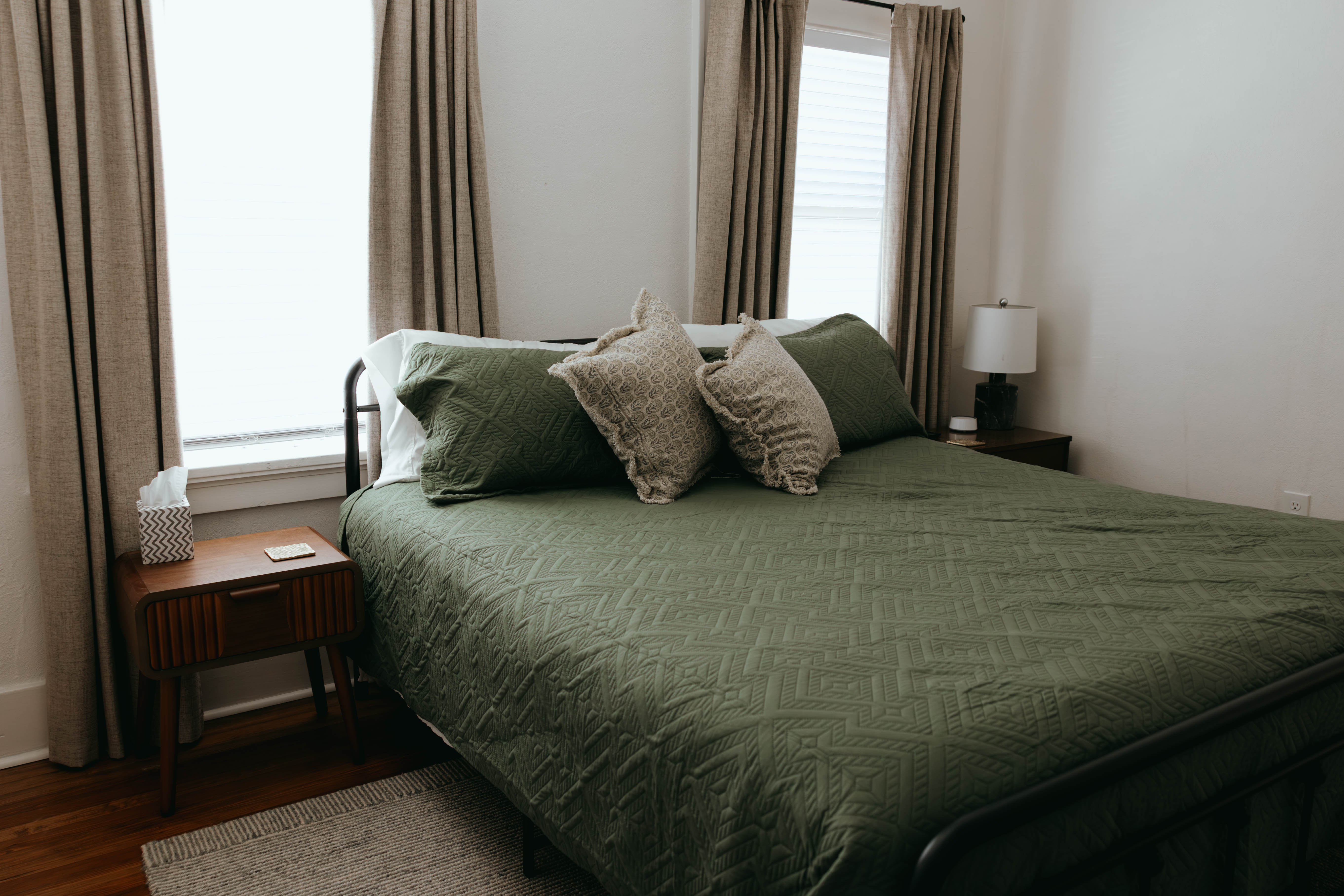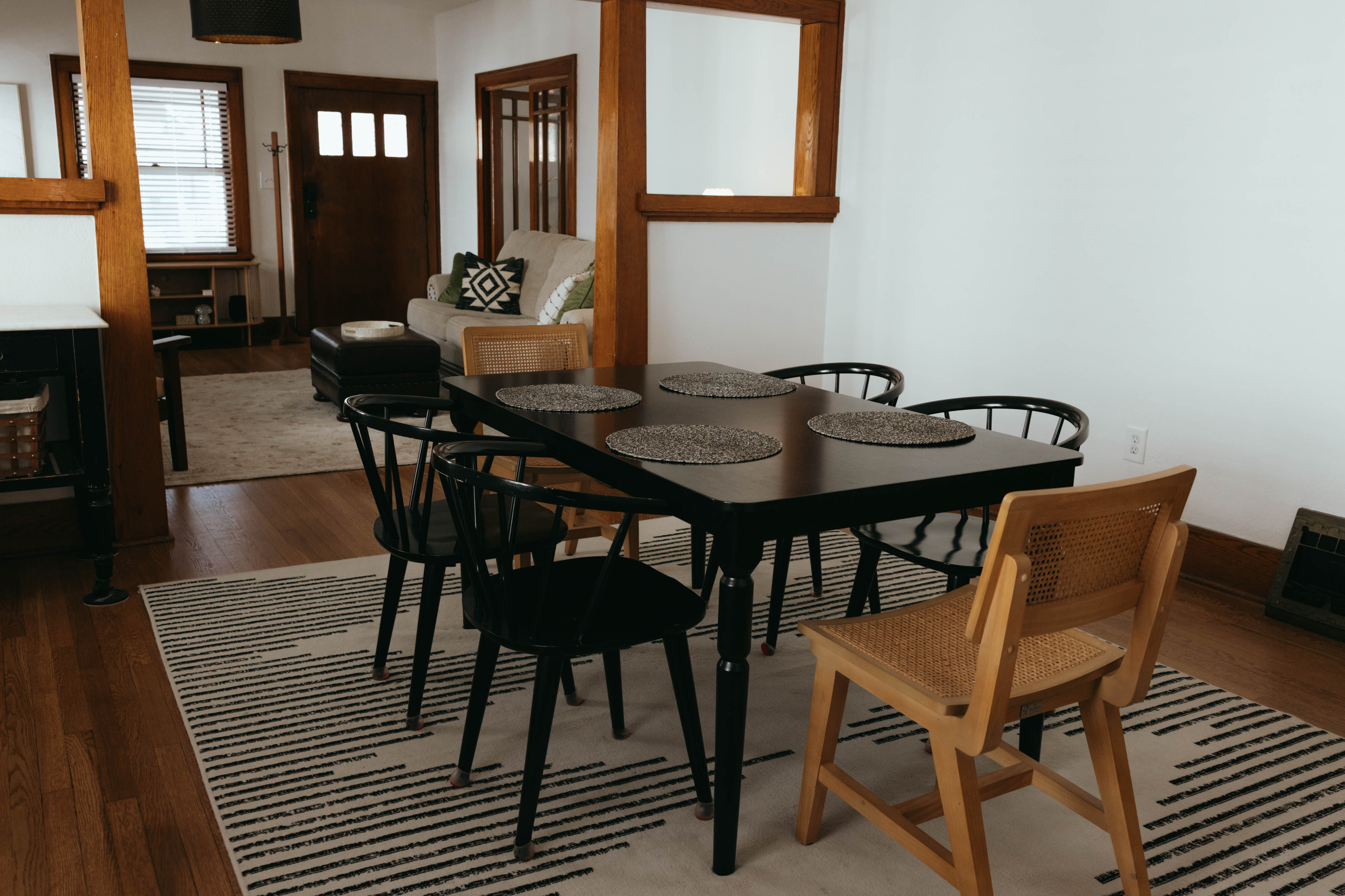 As you step inside, you’re welcomed by a bright, open-concept living and dining area that instantly feels like home. Just off the entryway, you’ll find a dedicated office and lounge space—perfect for remote work or a quiet place to unwind. While the home has been beautifully renovated, touches of its original character still shine through, especially in the living room. With comfortable seating for six and a large smart TV, it’s the ideal space to gather, relax, and make lasting memories. The dining area also seats six, offering a cozy setting to enjoy meals together. The kitchen is truly the heart of the home. From the charming checkered floors to the stunning green cabinetry, this space is both stylish and uplifting. Spacious and fully equipped, it has everything you need to make cooking effortless and enjoyable during your stay. Here's why you'll love it: -Updated stainless steel appliances -Coffee bar (standard drip coffee maker) -Ice and water dispenser -Dishwasher -Toaster -Blender Down the hallway, you’ll find both bedrooms, each thoughtfully designed with comfort and relaxation in mind. BEDROOM 1: -King bed -TV -Sound machine -Ceiling fan -Closet -Luggage rack -Full length mirror -Blackout curtains BEDROOM 2: -Queen bed -Sound machine -Ceiling fan -Closet -Luggage rack -Tower fan -Full length mirror -Blackout curtains Situated between the bedrooms is the newly updated bathroom. This moody, modern space is designed to help you feel refreshed and at your best. -Shower/Tub combo -Ample storage -Lots of counter space -Plush towels -Shampoo, conditioner, & body wash -Hair dryer In the basement you'll find the laundry facilities -- Perfect for longer stays. Start your day with coffee on the front porch or wind down in the evening on the back patio. From indoor comfort to outdoor relaxation, this home has everything you need—whether you’re staying for a few days or a while. We'd be so happy to host you! PLEASE NOTE: -Guests are not allowed to make a reservation in their city of residence. Guests with a 316 area phone number will be required to submit their drivers license upon approval. If there is a local address on the drivers license, the booking will be cancelled. No exceptions. -We only accept bookings from individuals aged 25 and older. Bookings made by anyone under the age of 25 will not be accepted.