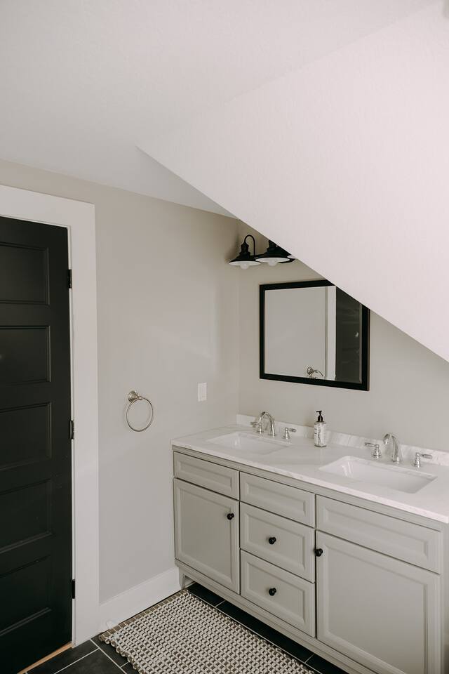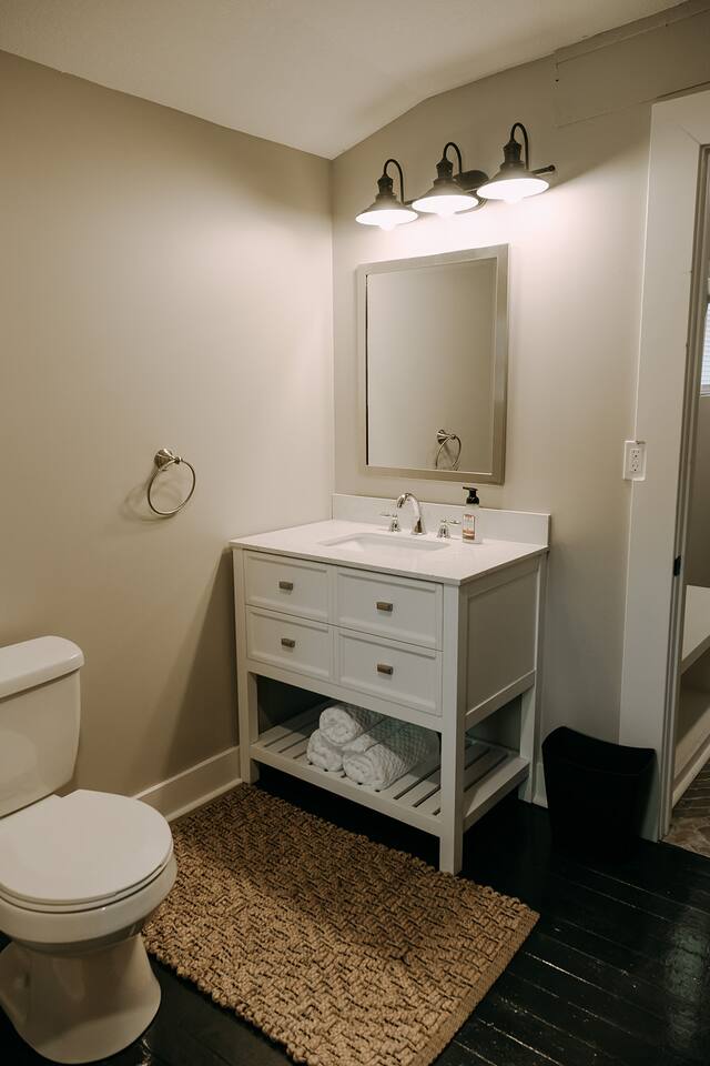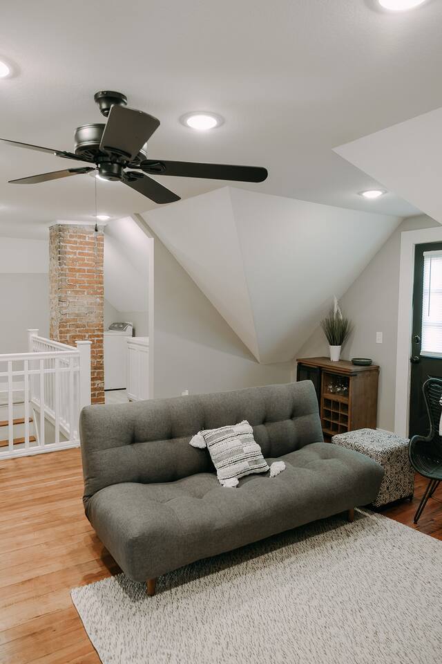 Please note, the stairs leading to the second level are fairly steep. There are 2 bedrooms on the main level (twin bunk bed + another twin bedroom as well as one of the queen bedrooms). The other queen bed is located upstairs as well as the bathroom with the standing tub. The laundry facilities are located upstairs as well.