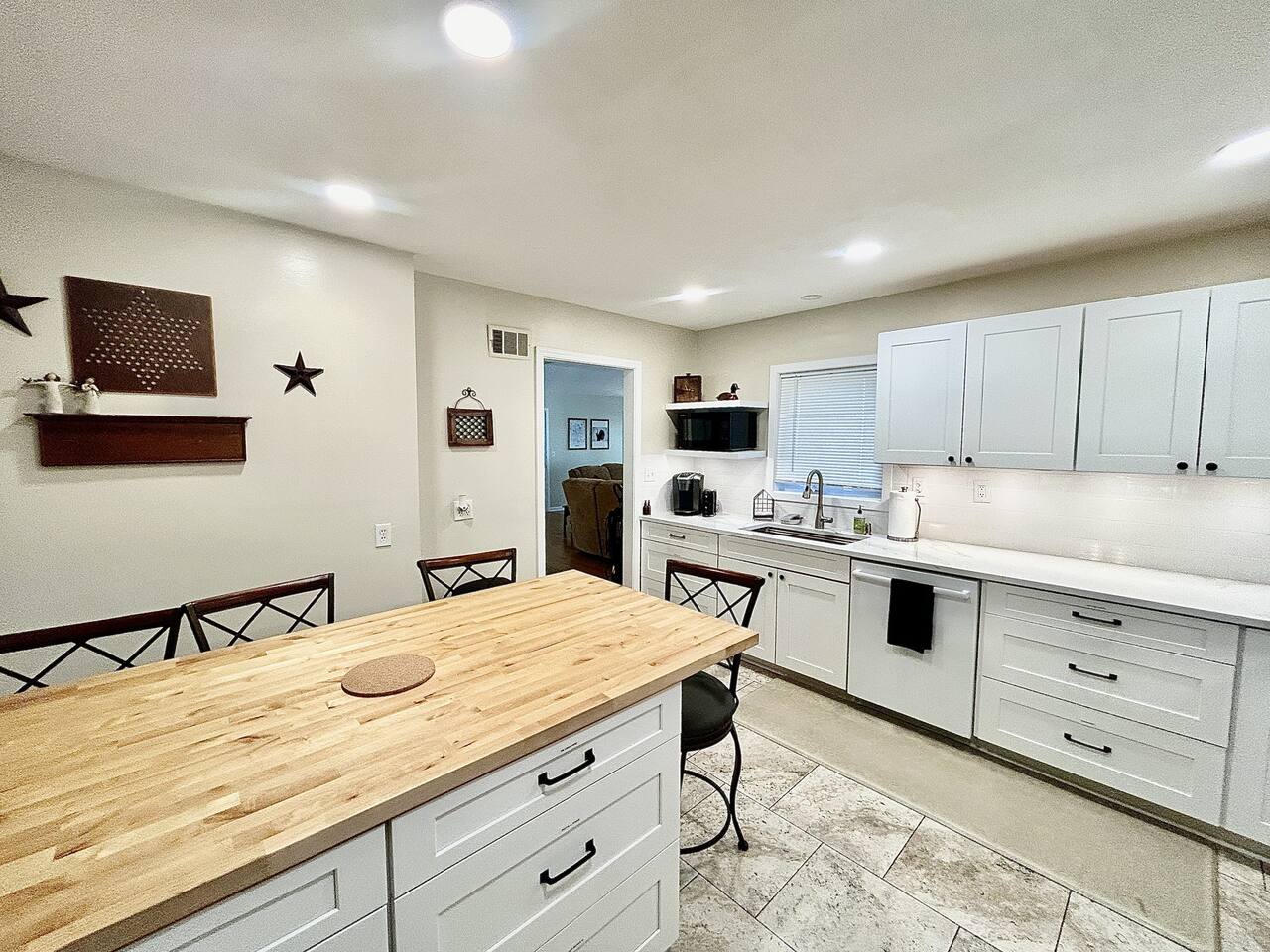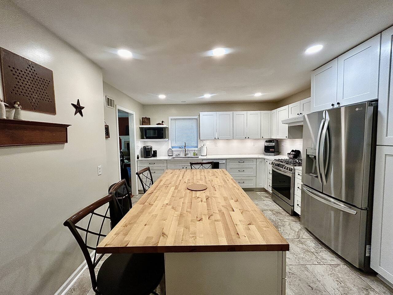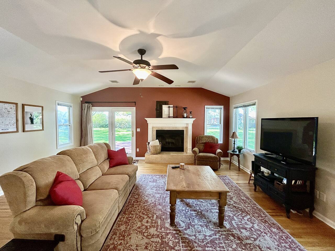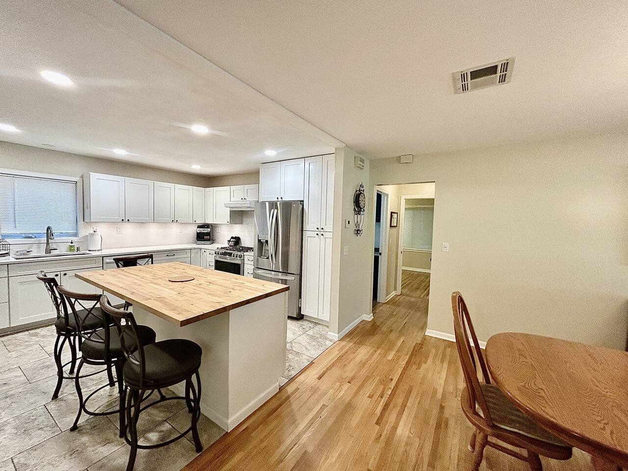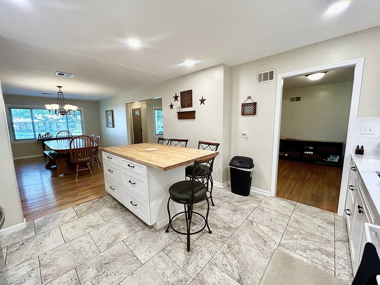 This sprawling 3-bedroom, 2-bathroom home seamlessly blends modern upgrades with generous gathering space. Recently renovated and fully equipped, it offers exceptional comfort and convenience for families, groups, or extended stays. With minimal entry steps and a single-story layout, accessing the home is effortless. Kitchen The centerpiece of this home is the newly renovated kitchen, boasting modern appliances, stylish countertops, and ample cabinet space. It includes a stainless steel refrigerator, gas stove, oven, microwave, and dishwasher. With everything you need on hand, meal preparation is effortless and enjoyable. Dining Room The spacious dining room is ideal for group meals, featuring a comfortable table that seats six—perfect for family dinners. Its open layout ensures easy access to both the kitchen and living room, making dining and entertaining a breeze. Living Room The living room is crafted for ultimate relaxation with cozy reclining sofas. Ideal for movie nights or peaceful evenings. The space fosters a warm and inviting atmosphere for everyone to come together. Natural light from large windows offers a delightful view of the backyard—perfect for watching kids or pets play. Master Bedroom - Queen Size Bed - En Suite Bathroom - TV - Ceiling Fan - Walk in Closet Master Bathroom - Soaker Tub - Walk in Shower - Double Vanity Bedroom 2 - Full Bed - TV - Ceiling Fan - Closet Bedroom 3 - 2 Twin Beds - Ceiling Fan - Closet Bathroom 2 - Tub/Shower Combo PLEASE NOTE: -Guests are not allowed to make a reservation in their city of residence. Guests with a 316 area phone number will be required to submit their drivers license upon approval. If there is a local address on the drivers license, the booking will be cancelled. No exceptions. -We only accept bookings from individuals aged 25 and older. Bookings made by anyone under the age of 25 will not be accepted. We can't wait to host you!